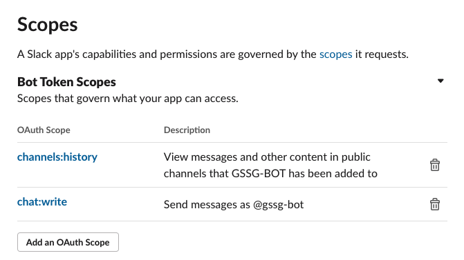 Bots으로 선택하고, Permission에서 scope를 주는 것입니다.