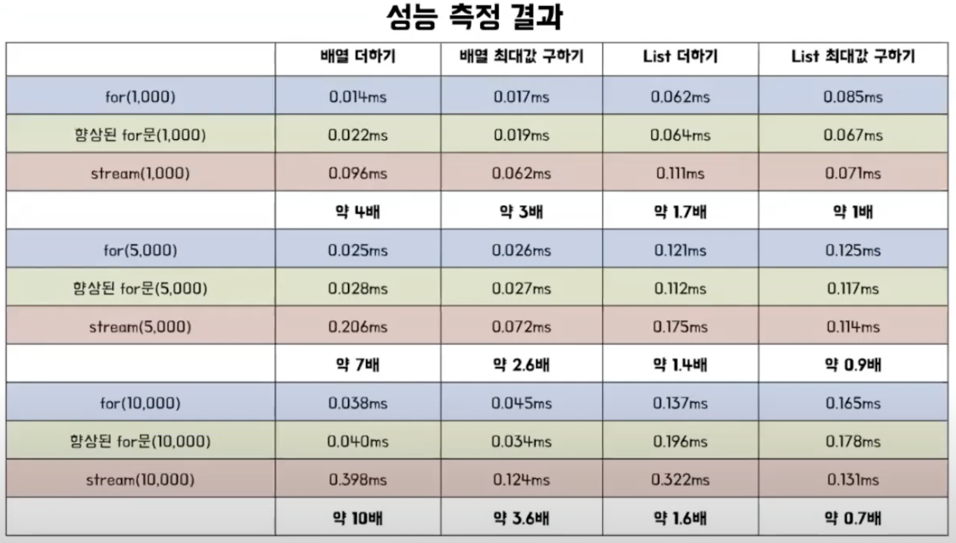 - stream 사용을 위해서는 boxing이 필요하지만, for문은 인덱스에 바로 접근하여 오버헤드가 발생하지 않습니다.